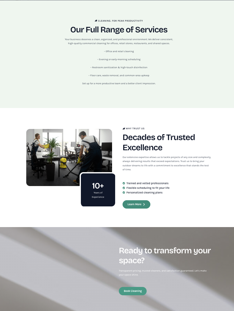– Trust & Optimization: Testimonials, professional visuals, and ongoing performance improvements ensure credibility and long-term effectiveness.